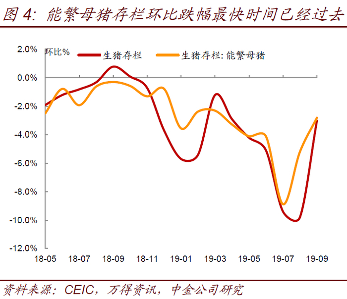 历史上能繁母猪存栏变化领先猪价4-5个季度,由于目前能繁母猪存栏仍在下跌,未来一年猪价可能仍将上涨(图1)。