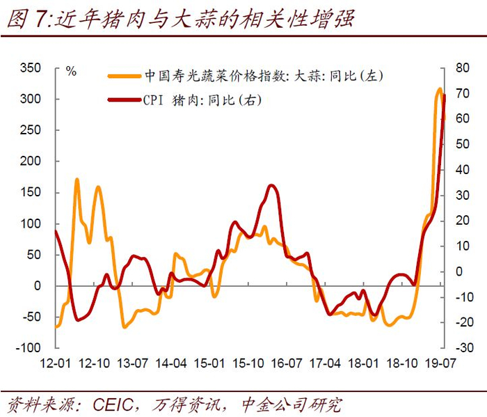 从历史来看,食品通胀是货币政策关注的指标,首先,食品价格上涨并非仅受偶发或临时性因素影响,有一定的需求侧原因,表明整体通货膨胀风险趋于上升。我们可以用大蒜的价格作为通胀预期的指征,因为一是大蒜耐储存,所以库存行为体现经销商对价格的预期;二是大蒜的需求比较刚性,作为中国菜肴必需的调味品,每人每天的消费量固定,即使单价上涨2、3倍但总价仍然较低,所以居民需求对价格上涨不那么敏感,大蒜库存的变动会敏感地反映在价格上。近年来大蒜价格与猪肉价格的相关性逐渐增强(图7),也说明猪肉价格本身具有一定的通胀指征性;而目前大蒜价格已经较9月底上涨36.36%,同比已接近300%,也表明这轮猪通胀已经抬升了通胀预期。第二,粮食、肉类等食品由于供给弹性较小的原因,价格短期内易涨难落,本身加剧了通胀的粘性和通胀预期,而央行最为关注的是通胀预期。
