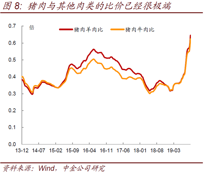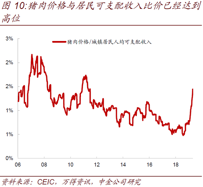我们认为猪价高点会较市场预期提前到来,因为各类企业补栏积极性很高,加上进口和其他肉类替代、行政调控等因素,而且65元/kg的猪价已经逼近牛羊肉的价格,很难继续上涨。从猪肉供给角度看,虽然目前主要生猪养殖上市公司仍在压栏、出货量没有明显提振,但近期农业部根据各省存栏数据判断生猪生产进入了止降回升的转折期,后续猪肉供给可能会边际缓解。而从需求端因素看,居民消费支出会明显影响CPI走势(图9),而居民消费支出受制于居民收入增速以及加杠杆能力的影响。自猪肉价格快速上涨以来,猪肉价格与居民可支配收入的比值持续攀升,目前猪肉与居民可支配收入的比价也已经达到1.44%,成为2012年以来高点,若猪肉价格年内继续上涨,那么猪肉价格和居民可支配收入的比值有望破历史新高(图10),而由于猪肉价格过高居民消费需求也会有所减弱,尤其是在P2P持续暴雷、居民信用卡监管趋严后居民加杠杆消费的能力已经明显减弱。目前羊肉、牛肉与猪肉价格的比价以及猪肉与蛋类价格的比价也已经接近历史低位(图8),意味着猪肉消费需求将向其他替代品需求转移,推动其他替代品价格上涨的同时,对猪价的影响就会更小。