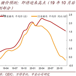 我们根据AR(1)+PDL统计模型发现,猪肉价格对能繁母猪产能的变化弹性在3左右(12个月内累计),即能繁母猪存栏增速每减少1个点,猪肉价格上涨3个点。目前能繁母猪存栏环比跌幅最快的时间已经过去(7月,环比-9%),9月环比已经升至-3%,接近此前的增速中枢-1%(图4)。过去12个月,能繁母猪存栏下跌了39%,考虑到能繁母猪存栏环比还未转正(而且能繁母猪产能的统计主要是针对规模以上的养猪场,由于猪瘟加速去化了很多中小猪场,所以实际的全国产能去化数可能高于统计值),存栏同比跌幅可能加速,因此未来1年内猪价同比高点一定高于120%。按目前的猪价涨幅线性外推并结合春节前后的季节性规律,我们认为22省猪肉平均价明年可能有两个高点,一次在春节的1月,达到60元/kg,第二次在4-5月,达到65元/kg。