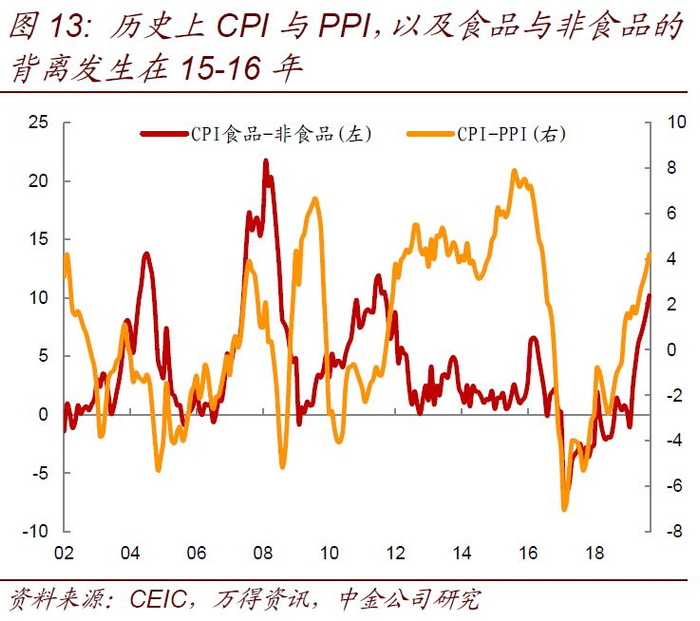 但这一次CPI上行呈现明显的结构性特征,即食品项CPI走强,而非食品CPI和核心CPI较弱。这主要是因为非食品中,不少产成品的原材料和中间产品来自于工业品,而工业品的原材料有主要来自各类大宗商品,因此历史上大宗商品价格对非食品CPI有较为明显的传导作用(图11)。近期商品价格尤其是黑色系价格下跌较快,反映贸易商对商品供需和未来走势不是很乐观,因此非食品CPI和PPI的疲弱可能仍将持续。历史上食品和非食品,以及CPI和PPI出现明显的背离发生在2015-2016年(图13),当时的环境是由于金融危机后企业投资过度,制造业产能过剩的现象日趋明显,制造业产能利用率也开始持续下滑,由于供给过剩而需求不足,因此工业品价格开始回落;与此同时,国际油价下滑明显,15-16年布油同比增速始终处于负区间,因此可以看到15-16年虽然猪周期带动食品项走弱,但CPI整体较为平稳,并没有明显上行压力,而PPI也较为疲弱。
