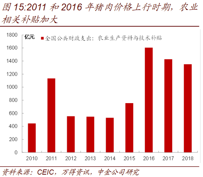 历次猪周期启动后,往往采取对养殖户以及困难群众进行财政补贴、收储投放等政策以平抑猪价(图15)。例如07年猪周期是,国家出台了一系列对能繁母猪补贴、生猪良种补贴、生猪大县奖等政策,以激发养殖户的积极性。目前针对猪肉价格大幅上行,多个部委陆续发布鼓励养猪的相关政策以及进行采用补贴的方式控制猪肉价格上涨。9月4日,财政部、农业农村部发布《关于支持做好稳定生猪生产保障市场供应有关工作的通知》,将补助经费由现行的按年度结算调整为每半年结算一次。中央和省级财政资金下达后,在3个月内将补助资金给付到位,减轻养殖场垫资压力。暂时提高能繁母猪、育肥猪保险保额,扩大育肥猪保险规模。完善种猪场、规模猪场临时贷款贴息政策,流动资金贷款贴息政策实施期限延长至2020年12月31日,并适当扩大贴息范围;9月5日,生态环境部、农业农村部联合印发《关于进一步规范畜禽养殖禁养区划定和管理促进生猪生产发展的通知》要求各地不得扩大禁养区划定范围,不得以改善生态环境为由,违反法律法规规定限制养猪业发展或压减生猪产能;9月6日,中国银保监会联合农业农村部印发通知,要求银行业金融机构进一步加大对生猪产业的支持。对符合授信条件但暂时遇到经营困难的种猪场、生猪规模养殖场和屠宰加工企业,要做好相关金融服务,不得盲目限贷、抽贷、断贷,并拓宽抵质押品范围;9月9日,国家发改委、农业农村部发布《关于做好稳定生猪生产中央预算内投资安排工作的通知》,其中涉及养殖场和养殖环保方面的部分补贴金额达到50%。近期,发改委拟先行下达中央预算内投资3亿元,对符合条件的养殖场给予补助。除了补贴养殖户,部分城市也给予消费者一定补贴,并出台相关限价限购政策。年初至今,各地已经累计发放临时补贴55亿元,以帮助缓解食品价格上涨对困难群众基本生活的影响。预计后续相关财政补贴仍将继续,一定程度上平抑猪肉涨价带来的通胀压力。
