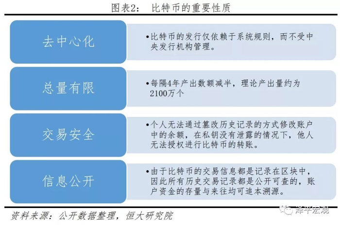 比特币主要具有四大特征:系统设定发行方式,不存在中央发行机构;年发行数量每四年减半,最终总量有限;余额信息难以篡改,交易安全有保障,系统整体稳健性强;历史交易记录公开。