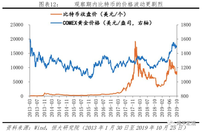 从价值稳定的角度,黄金的价格受到多种因素影响,蒋先玲(2017)的研究表明长周期下伦敦黄金现货价格周期与经济发展周期相反;中周期表现出与大宗商品价格周期相一致的特征;短周期黄金价格受到突发因素影响较大,投资者情绪和预期为波动主要原因。但是黄金的内在价值即作为商品包含的劳动时间价值是长期不变的,因为黄金开采技术多年来并未出现重大突破。比特币自诞生以来,对其内在价值的争论就从未停止,主要是因为比特币本身不包含劳动时间价值且不与任何实物资产挂钩,这也造成比特币的价格波动异常剧烈。我们取2013年1月30日至2019年10月25日的COMEX黄金价格和比特币价格进行计算,两者的标准差分别为104.16和3677.84,比特币在同期的价格波动远大于黄金,在价值稳定这一点上比特币无法和黄金媲美。