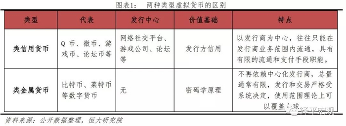 根据虚拟货币的发行方式的不同,可以将其分为两大类:一类是以腾讯公司的Q币、盛大公司的点券、各种论坛币、游戏币为代表的,有发行中心的类法定虚拟货币,其如信用货币一样,往往是信用货币,其发行受中心化机构决定。一类是以比特币等数字货币为代表的去中心化类金属虚拟货币,正如同现实生活中贵金属产量有限一样,类金属虚拟货币的货币发行数量往往受到算法严格限制。它们之间的主要区别如下: