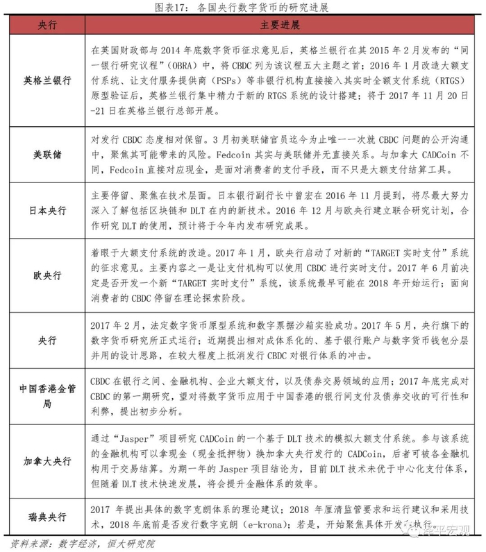 央行信用货币以国家信用背书作为支撑,具有法定强制流通能力。而比特币等加密货币则以密码学原理为基础,因为缺乏信用背书,也没有发行主体,币值易受外界政策变化以及投机行为影响,接受范围也相对有限。随着比特币和区块链技术的兴起,央行数字货币成为各国的重点研究领域,英国、加拿大等多国央行都表示将涉足该领域,但尚无一家中央银行拿出落地的实际应用。盛松成(2016)认为数字货币的技术创新无法取代央行货币发行和货币政策,有望在降低发行成本、确保资金安全和提高交易效率等方面发挥重要作用。