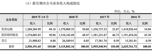 提供路网服务业务收入则逐年上升,2016年度至2018年度分别为119.15亿元、138.12亿元和151.02亿元,占比分别为45.38%、46.73%、48.47%,2019年1-9月达到127.40亿元,占比50.96%。