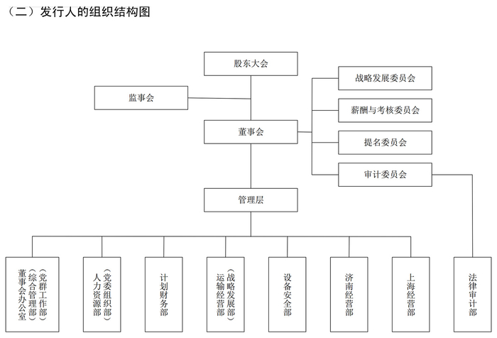 对于京沪高铁公司内部组织结构,招股书披露,目前,公司共设立董事会办公室(综合管理部、党群工作部)、人力资源部(党委组织部)、计划财务部、法律审计部、运输经营部(战略发展部)、设备安全部、济南经营部、上海经营部八个部门。