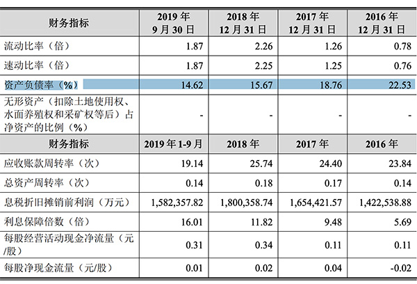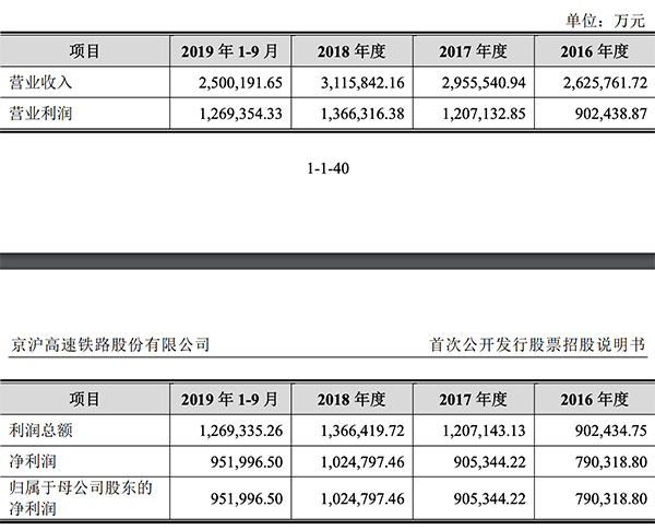 招股书显示,2016年度至2018年度,京沪高铁的营业收入连年上升,2019年1-9月营收达到250.02亿元;2018年度净利润达到102.48亿元。而京沪高铁的资产负债比只有14.6%。