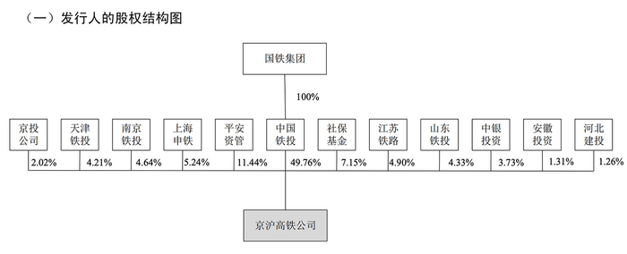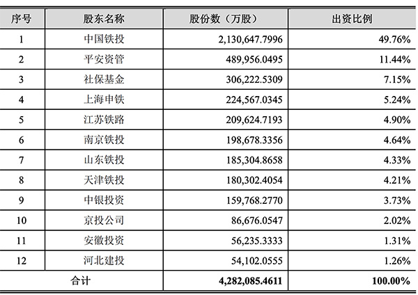 招股书显示,京沪高铁公司现共有12位股东,分别为中国铁路投资有限公司(简称“中国铁投”),持股49.76%;平安资产管理有限责任公司(简称“平安资管”),持股11.44%;全国社会保障基金理事会(简称“社保基金”),持股7.15%;上海申铁投资有限公司(简称“上海申铁”),持股5.24%;江苏省铁路集团有限公司(简称“江苏铁路”),持股4.90%;南京铁路建设投资有限责任公司(简称“南京铁投”),持股4.64%;山东铁路投资控股集团有限公司(简称“山东铁投”),持股4.33%;天津铁路建设投资控股(集团)有限公司(简称“天津铁投”),持股4.21%;中银集团投资有限公司(简称“中银投资”),持股3.73%;北京市基础设施投资有限公司(简称“京投公司”),持股2.02%;安徽省投资集团有限责任公司(简称“安徽投资”),持股1.31%;河北建投交通投资有限责任公司(简称“河北建投”),持股1.26%。