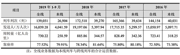 在旅客运输方面,2016年至2018年,京沪高铁本线列车列次逐年递减,但本线发送人次和周转量却逐年递增。在客座率方面,2016年至2018年,京沪高铁本线客座率分别为73.38%、80.18%和81.64%,呈逐年递增态势,2019年1-9月达到79.91%。