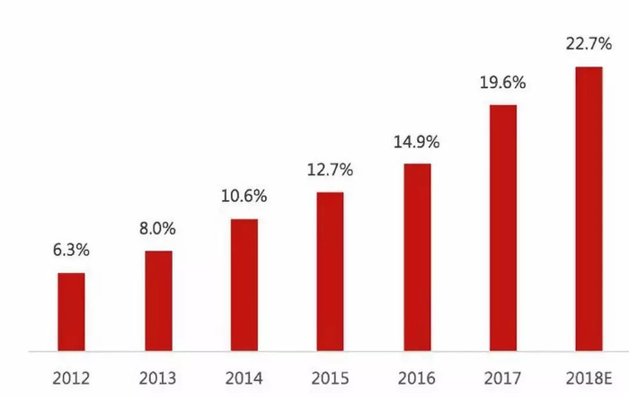 图:网购市场规模占社零总额%;Source:艾瑞