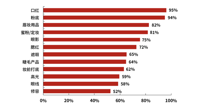 图:2017 彩妆产品大类渗透率;Source:2017年微妆赏调研,国盛证券