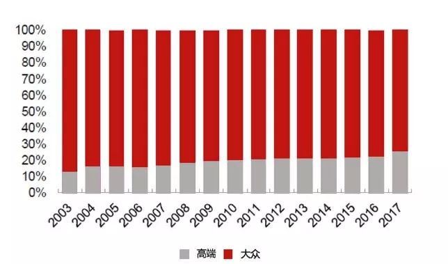 从2003-2007年的数据来看,大众产品占据主要市场份额,虽然近年高端产品增速较高,但长期来看,大众单品仍将占据绝对主流。