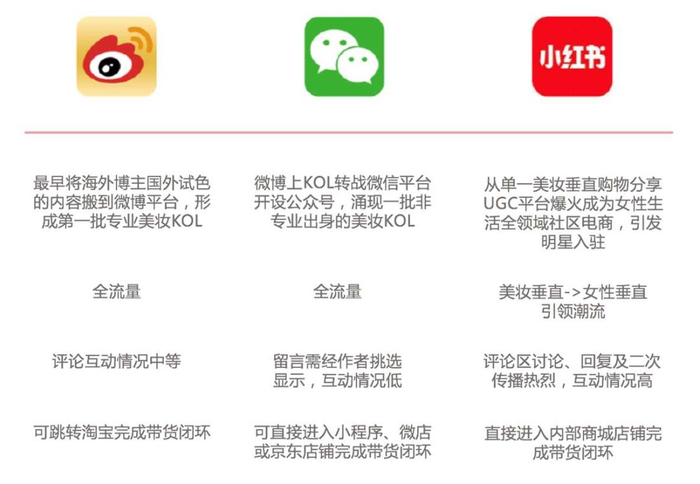 美妆的三大社交媒体是微博、微信和小红书。小红书和淘宝在内容上已成功打通,商家在编辑某个商品介绍时,可选择引用小红书相关“笔记”。