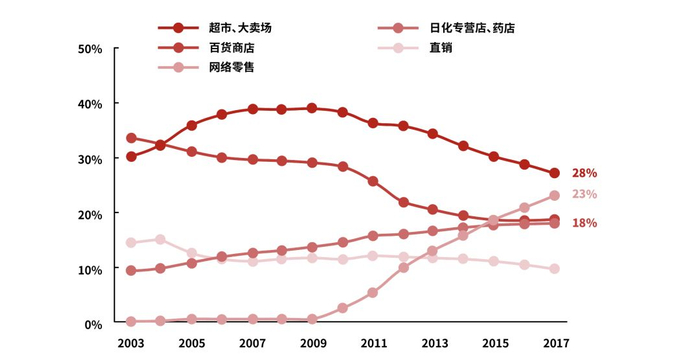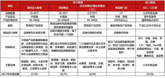 化妆品主要销售渠道(按市场份额)是超市及大卖场、电商、美妆专卖店(CS)、百货商店及单品牌门店。