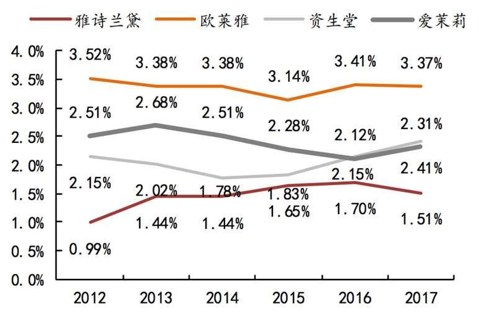 化妆品集团的研发费用通常很低,真正的技术意义上的创新可能3-4 年全球才出现一个,我们通常见到的创新大多是产品配方的升级换代、包装形式的改良、以及概念塑造的更新。