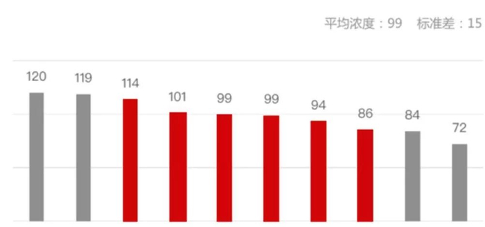 低品牌忠诚度也进一步驱动了品牌分散化,给了新品牌更多出头机会。根据腾讯社交大数据,在微信投放Top10的美妆品牌中,有6个品牌兴趣浓度在均值的 1 个标准差范围内,差异度较小。