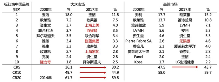 在大众 vs.高端,美妆 vs.个护共四个组合市场中,大众+美妆市场集中度下降尤为明显,CR5/CR10 分别由 2008 年的 36.1%/49.7%下降到 2017 年的 30.2%/44.9%,CR20 由 2014 年的 61.7%下降到 2017 年的 59.8%。