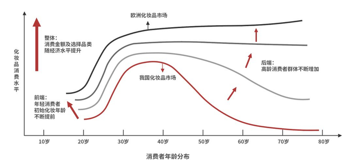未来,随着消费者的年龄增长和化妆品消费意识的普及,中国将向欧洲曲线靠拢,但变化将以 10 年为维度。