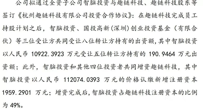 2018年4月,新湖中宝以257.6586万元、1224.5709万元,取得趣链科技0.48%股权和2.27%,趣链科技估值约5亿元;2018年5月,继续使用12亿投资趣链科技,累计持股49%。