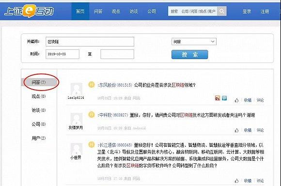 很多投资者也会要翻一翻自己的账户,看看户头里有没有一两只区块链概念股。若是没有,就会去两大交易所的投资者互动平台问一问,公司到底有没有相应题材。所以,一时间,区块链这个关键词刷爆投资者互动平台,特别是深交所互动易。