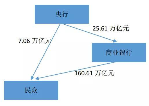 也就是说,央行向民众发行了7.06万亿元的纸币,同时还向商业银行发行了25.61万亿元的储备货币(大部分是银行存在央行账户上的准备金,少部分是银行库存现金),然后银行再以这25.61万亿元的储备货币为基础,向民众发行了160.61万亿元的存款货币(如下图)。