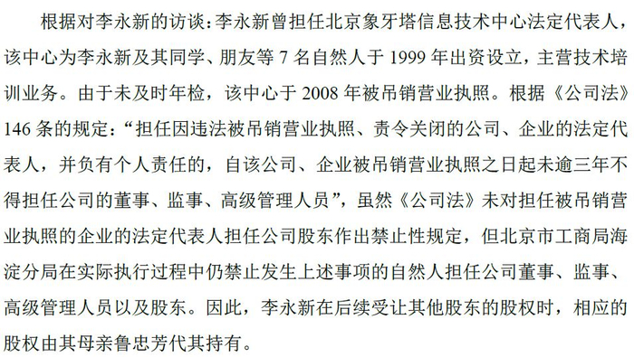 巧合的是,鲁忠芳投资中公教育的时间为2010年,恰好处于李永新被禁止担任公司管理人员和股东期间。因此不难推论,鲁忠芳大概率是代子持股。