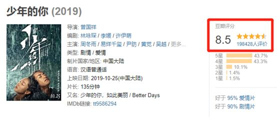 《少年的你》在豆瓣评分上达到了8.5分,好于95%的爱情片和90%的剧情片。