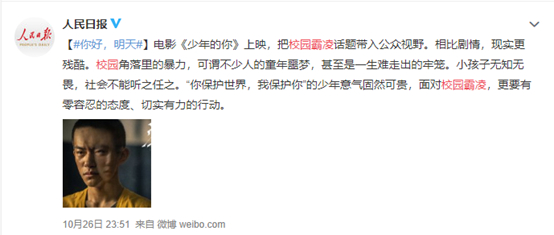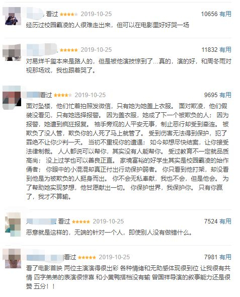 同时,该电影把校园霸凌话题带入公众视野。连人民日报和山东共青团都发文打call。