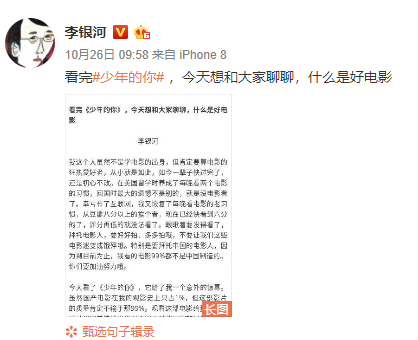 中国著名社会学家李银河发微博点赞《少年的你》, “你要是没看《少年的你》,你就不会知道中国的电影现在已经好到了什么程度”。
