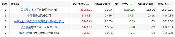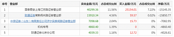 卖出金额前5名卖出总计7.22亿元,占当天总成交金额20.71%。其中,财通证券常熟枫林路卖出1.59亿元。中信证券(山东)济宁吴泰闸路卖出7098.68万元。此外,还有一名机构席位卖出4860.40万元。