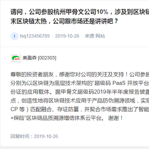 10月26日,美盈森公司在深交所互动易平台回复投资者时说:“公司参股公司甲骨文超级码核心产品“两个平台一个载体“:
