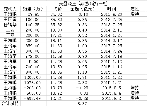 在2013年至2015年期间,王氏家族为了阻止公司股价的疯长,全家齐上阵进行股份减持,期间共减持入袋8.87亿元。