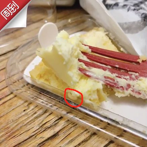 一开始,黄女士以为蛋糕上有飞虫,但是,看到蛋糕的那一刻,黄女士着实是又惊吓又恶心——竟然是一条一厘米长左右的白色蛆虫,正从蛋糕里爬出来。