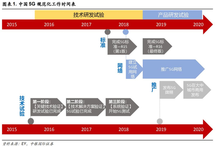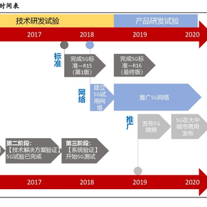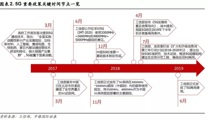 从顶层设计提出到最终商业化仅耗时2年半,5G推动彰显中国速度。2017年3月,政府工作报告首次提到5G通信技术,指出:“全面实施战略性新兴产业发展规划,加快新材料、人工智能、集成电路、生物制药、第五代移动通信等技术研发和转化,做大做强产业集群”, 5G被置于国家战略。同年3月,工信部宣布中国已在北京市怀柔区建成了全世界最大的5G试验网。同年6月,工信部公开征求对5G(IMT-2020)使用3300MHz~3600MHz和4800MHz~5000MHz频段的意见。同年11月,工信部正式发布了5G系统在3000MHz~5000MHz频段(中频段)内的频率使用规划,将3500MHz、4800MHz作为中国5G系统掀起部署的主要频段。同年12月,中国5G标准第一基础版本制定完成。2018年4月,工信部发布《5G发展前景及政策导向》,初步设定国内5G将在2019年下半年初步具备商用条件。同年7月,工信部、发改委印发《扩大和升级信息消费三年行动计划》,提出加快5G标准研究、技术试验,推进5G规模组网建设及应用示范工程,确保启动5G商用。2019年6月,工信部正式发放了5G商用牌照。