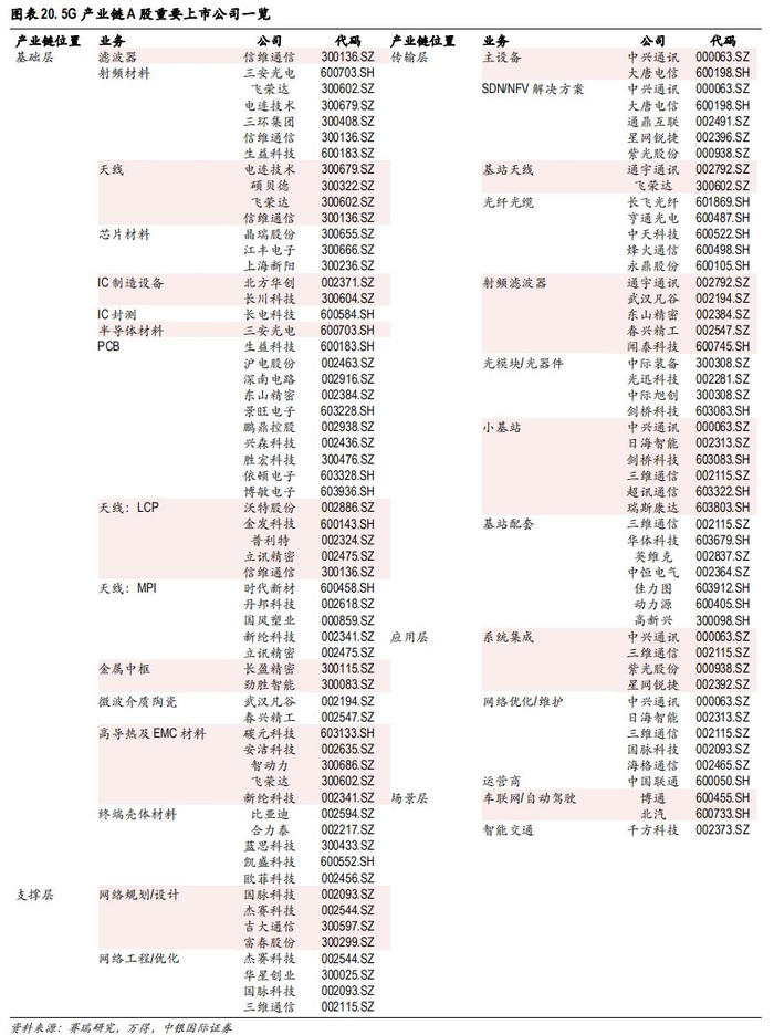 5G生态体量庞大,产业联动与协作紧密。按照产业中的分工划分,5G产业链可分为上游(支撑层、基础层)、中游(传输层)以及下游(应用层、潜在场景层)。5G行业产业链上游产业主要包括芯片市场、光器件市场、射频器件市场;中游产业主要包括基站市场、传输设备市场、基站天线市场;下游产业主要包括运营商市场和终端设备市场,以及潜在的场景应用市场,包括5G与人工智能、大数据、云计算等的结合从而衍生出的无人驾驶、智慧城市、物联网、智能医疗等带来生活便利的丰富场景。