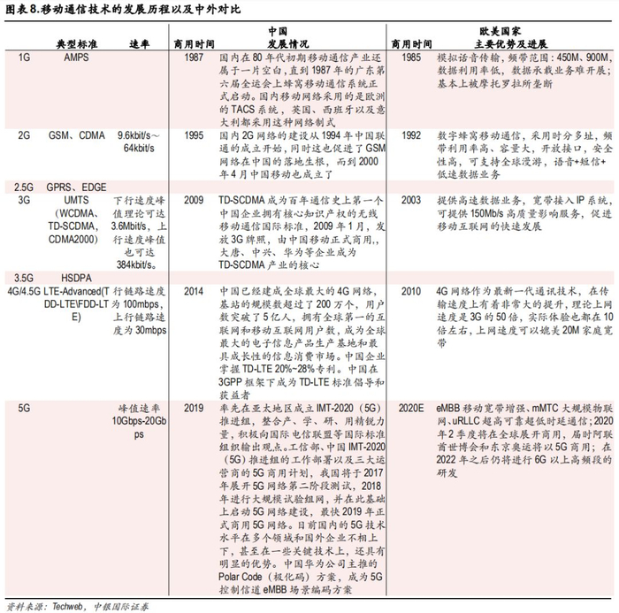 移动通信技术大致10年左右一个生命周期,目前全球范围来看均处于5G新周期初期。从之前几代移动通信技术的迭代历程看,技术生命周期大致为10年左右。1G时代开启于1985年,只能传输模拟语音;2G开始进入了数字通讯年代,国际上2G使用周期从1992到2002年左右,也是大概10年周期,我国的2G网大概从95年左右才算是正式开始普及; 3G开始进入了移动数据时代,国际上3G使用周期是2002到2013年左右,也是10年生命周期,我国进入3G时代较晚,为等自主研发的TD-SCDMA上线3G从2008年北京奥运才开始试商用;4G开创了高速移动互联网时代,平均每户每月上网流量DoU达到5G,国际上4G使用周期是2010至今,国内则是2013年年底至今。当前时点全球均处于5G新周期初期,中国目前是5G新周期最先的一批进入者。