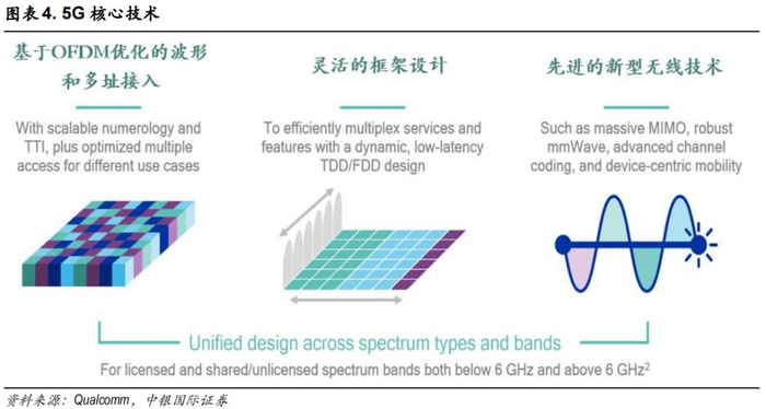 5G是第5代移动通信技术,以全新的网络架构提供Gbps级的用户体验速率。根据IMT-2020(5G)推进组发布的《5G概念白皮书》,综合5G关键能力与核心技术,5G概念可由“标志性能力指标”和“一组关键技术”来共同定义。其中,标志性能力指标为“Gbps用户体验速率”,一组关键技术包括大规模天线阵列、超密集组网、新型多址、全频谱接入和新型网络架构。5G通信的特点主要体现在关键任务、加强宽带以及大量设备三个方面。其中,5G通信的关键任务主要包括保证通信的强安全性、超高可靠性、超低延迟、完美移动性;加强宽带要求提升网络的极限宽带及极限容量;5G万物互联时代网络需承载大量设备,这时5G通信超高密度、超低复杂度、超低功耗及深度覆盖的特性就会凸显出来。