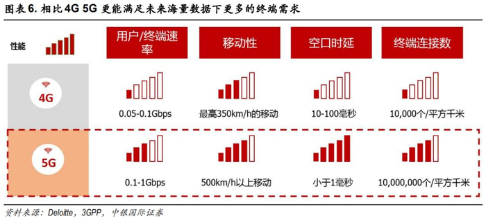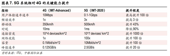 5G是对4G的颠覆性改变,核心关键能力全面提升。5G 并不是 4G 基础上的一次增量式改进,而是移动通信技术的下一次重大演进,其性能相比当今网络将提升几个数量级,峰值速率、移动性、时延和频谱效率等通信核心指标全面提升。5G将连接新的行业催生新的服务,并带来新的用户体验。