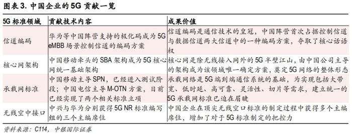 政策提振中国5G移动通信技术的发展,中国走在5G时代前列。发展至今,中国企业已具备充足的5G商用技术储备,并且在局部核心技术领域占据世界前列。2016年11月,华为主导的Polar码核心技术被3GPP确定为5G eMBB(增强移动宽带)场景的控制信道标准方案,中国企业首次真正意义上占据通信标准的核心技术。2017年6月3GPP正式确认在5G核心网上采用中国移动牵头提出的SBA架构(Service-Based architecture/基于服务的网络架构)作为统一基础架构,同年11月华为提出的FlexE 2.0帧格式以及时间同步方案在5G承载关键国际标准中脱颖而出。国际电信联盟第十五研究组(ITU-T SG15)2017~2020研究期第二次全会上,中国电信主导推动的M-OTN(面向移动承载优化的OTN)标准取得实质进展,实现了两个相关的标准立项。同时,由中国电信牵头提出的5G传送网络架构作为关键内容之一被纳入5G承载技术报告GSTR-TN5G。2018年2月26日举行的世界移动通信大会期间,中国移动公布了最新研发成果——已基于3GPP新空口标准,率先实现了全球最大规模的基站、终端芯片和测试仪表端到端互通,并首次发布了5G核心网预商用产品样机测试成果。这些由中国企业确立的技术标准都将成为中国发展5G网络的有利基础,有效打破过去核心技术被外国企业垄断的局面,从各种层面上给予国内的合作伙伴以广泛支持。