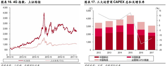 伴随A股大牛市的结束以及运营商CAPEX的回落,4G板块结束了高增长阶段进入了发展平稳期,2016年4G板块涨跌幅为-10.67%,这一年行业基本面并未出现明显转变,设备商毛利率还是获得了大幅增长,但此前过高的估值面对运营商CAPEX的回落以及市场偏好板块的转移多少有些力不从心。2018年年中,4G行业出现标志性拐点,中移动 4G 用户首次负增长,人口红利消失,运营商进入存量竞争时代。