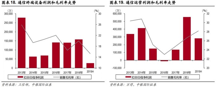在4G周期内,通信行业的各细分领域业绩轮动释放。纵观整个4G周期,产业链各子行业的业绩释放节奏并不同步,存在着显著的先后顺序。通信传输设备盈利能力进入4G时代后逐年上升,于2016年达到顶峰后再度回落。该子板块的扣非归母净利润由2013年的204,603亿元上升至2016年的655,158亿元。之后由于行业内部竞争加剧,多数公司盈利能力受到很大影响,2018年仅为353,916亿元。除中兴通讯外,通信传输设备商内部竞争激烈,中兴通讯由于其产品集成了大量的零件,产品具有较高的增值,因而议价能力较高。通信配套服务行业的盈利能力与通信传输设备呈相近的变化趋势。2013年通信传输设备行业的销售毛利率仅为14.8%,该年度的扣非归母净利润为-2,087亿元,但之后几年大为改善。2013年至2016年间该行业的利润呈稳步增长的态势,但2017年时再次大幅回落,该年度仅有20,709亿元,和上一年度相比下降了370,273亿元,销售毛利率也是下降了5.4%。2018年行业甚至处于亏损的状态。此变化原因也是由于行业内部竞争不断加剧,此外三大运营商资本支出的减少更是给通信配套行业的发展雪上加霜,行业的需求维持低迷状态。部分公司试图探索新业务以期增加公司收入,但是新业务也需要较高的成本加之激烈的行业内部竞争,净利润下降短期或是难以抑制之势。通信运营子板块盈利能力自进入4G时代以来一直处于波动的状态,2016年后达到谷底后回升趋势较为明显。通讯运营包括个人通信、企业通信(通信资源、专用终端、软件平台)、物联网(目前终端侧为主)相关标的。在2013年中国移动大规模快速建网的背景下,通信运营板块扣除非经常性损益的归属母公司股东的净利润合计处于高位并在2014年达到顶峰413,063亿元。之后逐年下降,在2016年达到谷底后再次反弹,2018年扣非归母净利润再次达到峰值555,643亿元,此年度的销售毛利率达26.7%。终端设备利润增速在2013年达到峰值后大幅下降,2014年起逐渐回升。2013年度发放4G拍照,4G正式商用,故此年度该子板块的营收达到峰值,该年度的扣除非经常性损益的归属母公司的净利润达到277,823亿元,销售毛利率也达到25.9%的高位。2014年终端设备的利润相较上一年度大幅下降,此年度的扣非归母净利润仅为63,398亿元。自2014年起营收一直处于上升的趋势,但2016年后增速放缓,这主要是因为进入4G后周期阶段后通信网络的升级使得市场对终端设备的需求下降。
