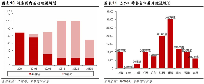 5G投资周期将比4G更长,投资强度更大。中国4G的建设周期花了6-7年的时间,总计7000-8000亿元的建设投资,相当于运营商平均每年投入1000多亿元。得益于3G技术的成熟,部分基站设备通过增加板卡+软件升级方式来实现4G部署,立杆、天线面基本不用动,大大节约了运营商发展4G网络的时间。而5G的建设周期预计将比4G更长,由于基站发射功率的上升基站的数量要求也在提高。工信部赛迪智库的相关测算表明,为了达到理想的响应速度,单从基站建设角度看,5G投资大约是4G的1.5倍,全国总体投资规模将达到1.2万亿元,投资周期超过8年,最终5G的基站数量将至少是4G的4-5倍,5G基站成本也将超过4G基站的2倍,功耗则是4G基站的3倍。
