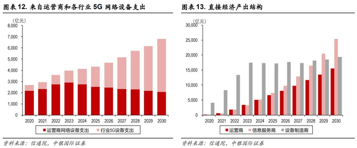 前期设备制造商更受益,后期信息服务商产出占比最高。从产出结构看,拉动产出增长的动力随 5G 商用进程的深化而相继转换。在 5G 商用初期,运营商大规模开展网络建设,5G 网络设备投资带来的设备制造商收入将成为 5G 直接经济产出的主要来源,预计 2020 年,网络设备和终端设备收入合计约 4500 亿元,占直接经济总产出的 94%。在 5G商用中期,来自用户和其他行业的终端设备支出和电信服务支出持续增长,预计到 2025 年,上述两项支出分别为 1.4 万亿和 0.7 万亿元,占到直接经济总产出的 64%。在 5G 商用中后期,互联网企业与 5G 相关的信息服务收入增长显著,成为直接产出的主要来源,预计 2030 年,互联网信息服务收入达到 2.6 万亿元,占直接经济总产出的 42%。