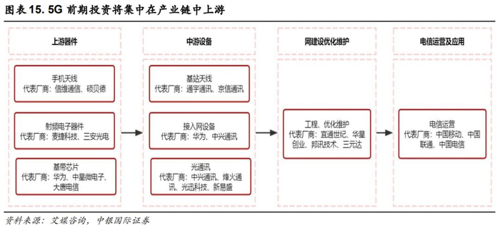 5G作为未来数字化经济的基础将推动全产业链的发展,前期投资将集中在产业链中上游。通信技术迭代对于产业链的影响主要有两条路径:一是投资路径,通信技术迭代将激发各领域加大数字化投资,加速 ICT资本深化进程;二是消费路径,通信技术迭代通过促进业务应用创新、挖掘消费潜力扩大消费总量影响产业链。从产业周期角度看,新通信技术的的推广建设将依次惠及网络规划、芯片厂商、基站建设、终端设备商等产业链上的重点环节。作为未来数字化经济的基础,5G的快速发展,将激发各领域加大数字化投资,加速 ICT 资本深化进程,引发新一轮投资机会。未来几年是5G周期的前段,按照产业链爆发顺序上游器件、中游设备、网建设优化维护及电信运营及运用短期将迎来更大机会。产业链下游方便,电子元器件、终端应用等领域在内的转型升级也值得关注。