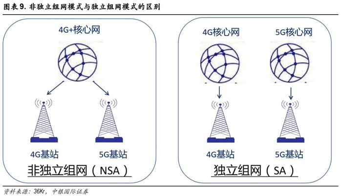 5G投资周期将比4G更长,投资强度更大,建设周期将分为两个阶段,由NSA主导逐步过渡至SA主导。5G的建设周期预计将比4G更长,单是基站建设角度,5G投资规模将达到1.2万亿元,投资周期超过8年。5G网络。5G的建设周期预计将分为两个阶段,一是NSA主导期,目前技术成熟,可快速实现大面积覆盖;二是SA主导期,实现5G基站连接5G核心网的5G网络架构终极形态,可以支持5G的所有应用。