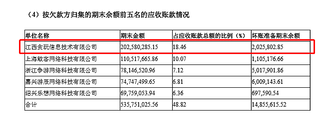 恺英网络2019年半年报显示,江西贪玩还是恺英网络第一大欠款方。