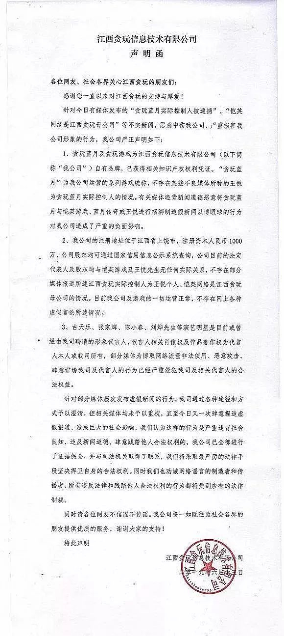 6月13日,《贪玩蓝月》官方微博发布声明称,贪玩蓝月及贪玩游戏为公司自有品牌,公司目前的法人及股东均与恺英游戏及王悦无任何实际关系,不存在部分媒体报道所述江西贪玩实际控制人为王悦个人、恺英网络是江西贪玩母公司的情况。
