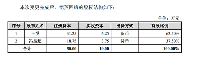 恺英网络注册成立于2008年10月30日,两位股东冯显超和钱华实际出资10万。